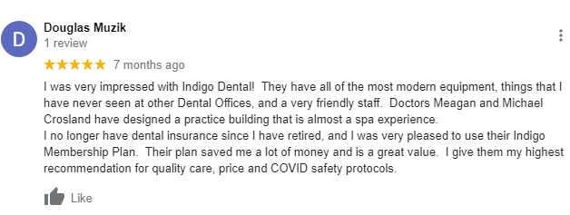 "I no longer have dental insurance since I retired, and I was very pleased to use the Indigo Membership Plan. Their plan saved me a lot of money and is a great value. I give them my highest recommendation for quality care, price, and COVID safety protocols."